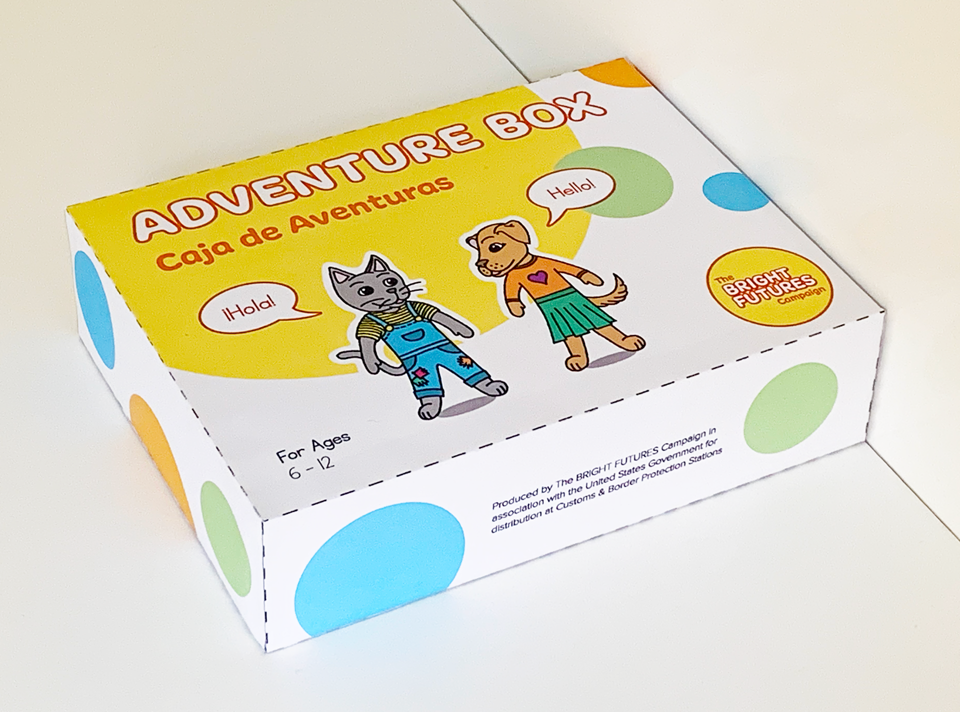 I designed this packaging and corresponding branding visuals for a fictional non-profit organization which steps in at U.S. Border Patrol facilities to help take care of children who were forcefully separated from their families while attempting to cross the U.S.-Mexico border. I designed a small box that the non-profit, called The BRIGHT FUTURES Campaign, hands out to each child to help them pass the time, interact with others, and show them that people are looking out for them. The box contains crayons, stickers, games, and two toys modeled after the cartoon animal mascots of the brand.